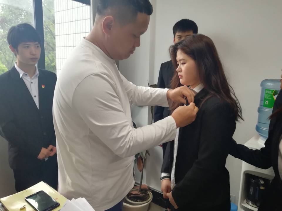 全体党员在任志君书记的带领下面对党旗重温了《入党誓词》,随后任志君书记亲手为党员们佩戴党徽。