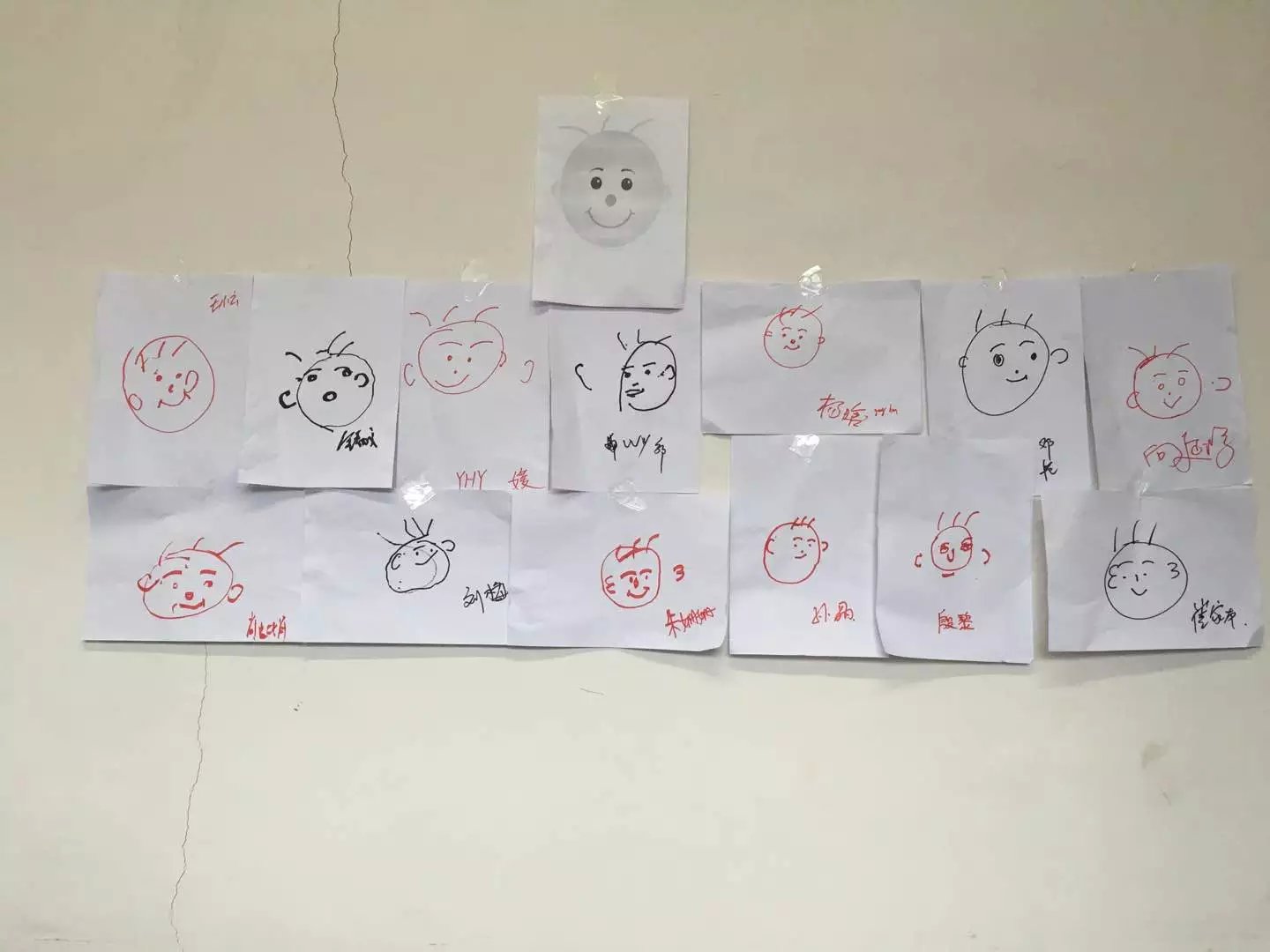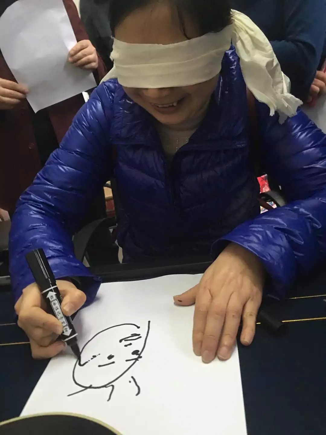 比赛第二项,蒙眼作画。所有的女教师蒙上眼睛,用A4纸统一画一幅画,看谁画的最接近原图。