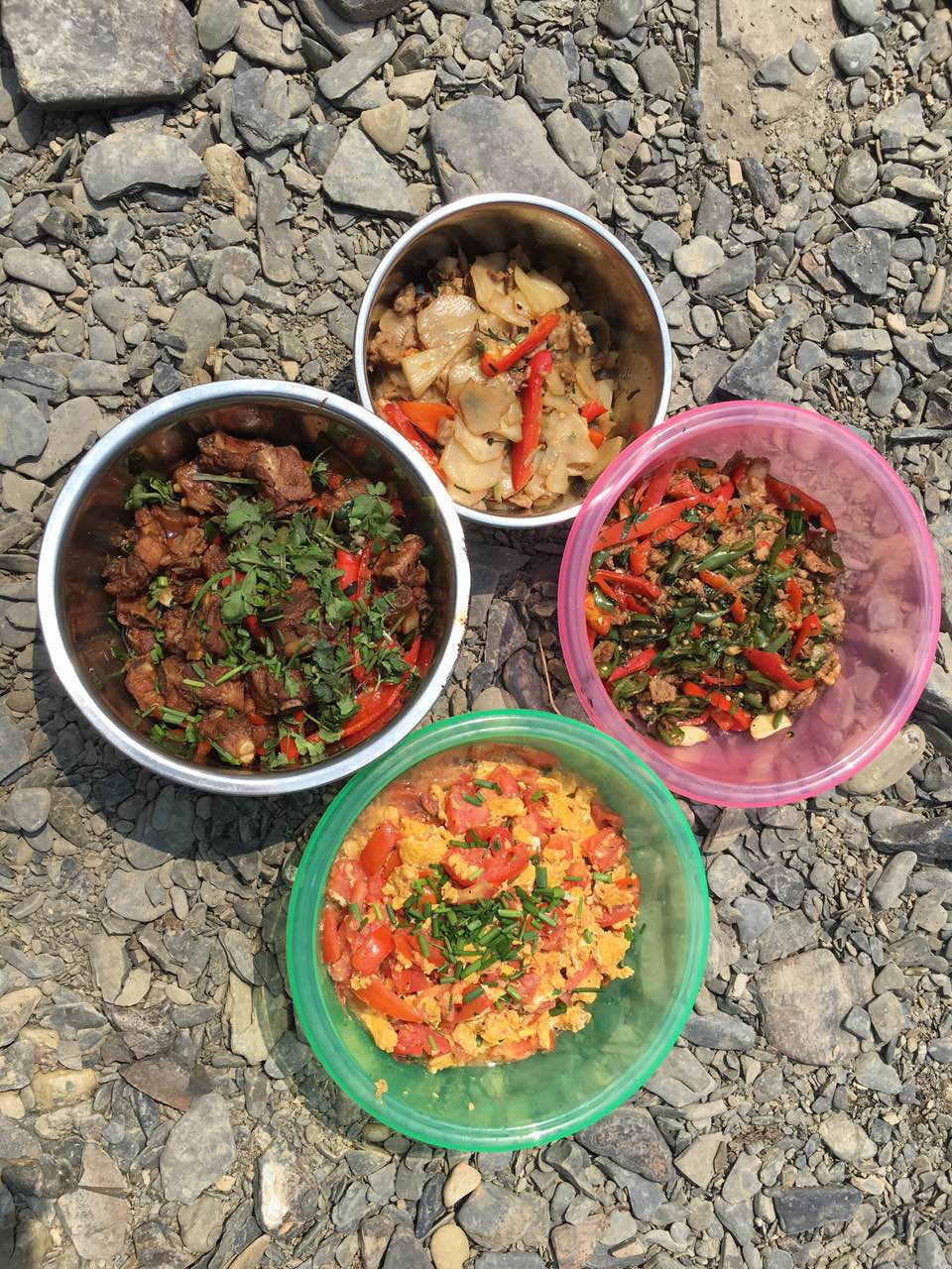 早上8:00,教职工分组采购了各自需要的食材,带齐工会统一购买的野炊用具,10:00兴致勃勃地从砂子坳校区出发,经过大约半小时的车程,来到了吉首市小溪镇。这里群山环绕,一条清澈的小溪穿过山间,溪摊宽阔平整,是一个野炊的绝佳场地。到达目的地之后,每个小组选定自己的场地,马上投入到野炊活动中,支灶、生火、洗菜、切菜、炒菜……不一会儿,在袅袅炊烟中,水煮鱼火锅、羊肉串烧烤、腊肉野菜小炒等各色佳肴纷纷登场,整个溪滩上香气缭绕。开餐时,大家打破了组的界限,你来我往,欢声笑语不断。