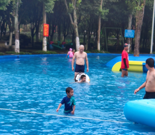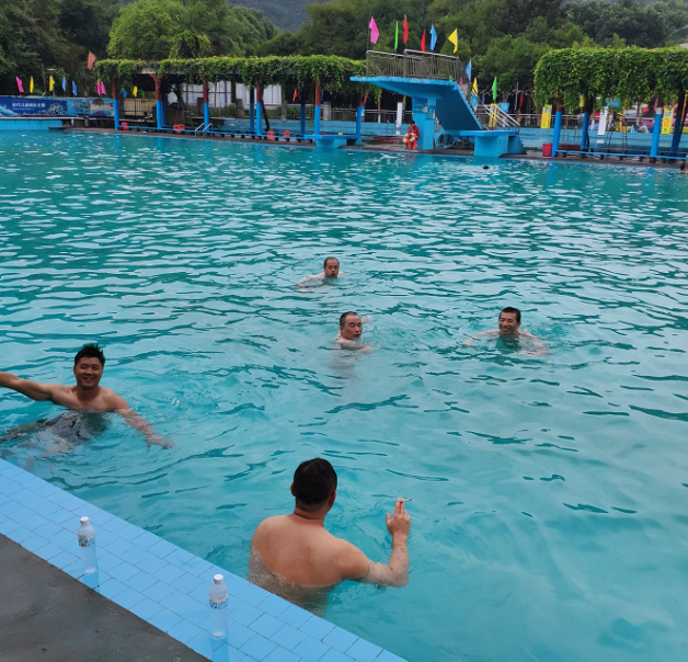 购买门票后,大家逐一进入活动场地,更换泳衣,纷纷下水游玩。左图是在成人泳池的教师,大家互相讨论游泳经验,并相互展示了各自游泳技巧,有的老师还站上了跳台进行跳水表演。右图是趣味滑道泳池,配有多种高度的滑道和充气城堡,教师们带着小孩在里面尽情的体验游泳乐趣,同时也能增加了亲子关系。