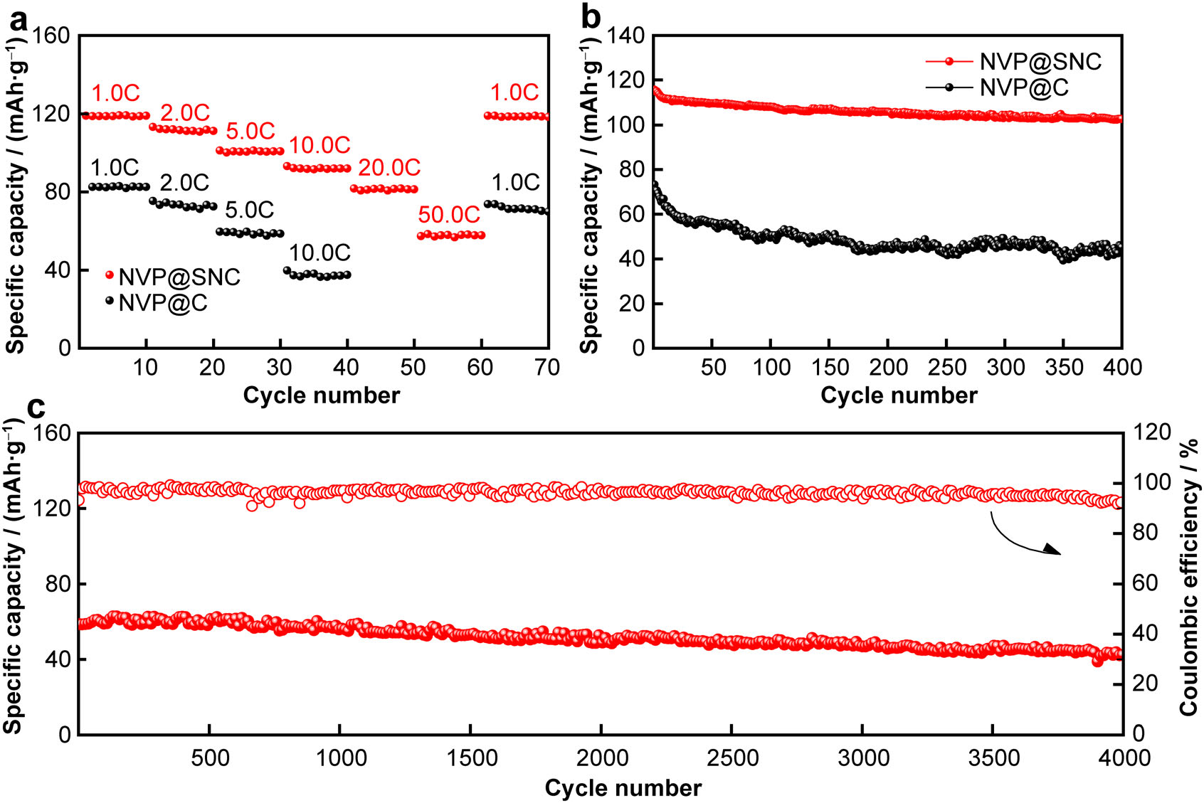 1. (a) Rate capability, (b) cycling performances of the two composites at 2.0 C and (c) long cycling performance at 50.0 C of NVP@SNC