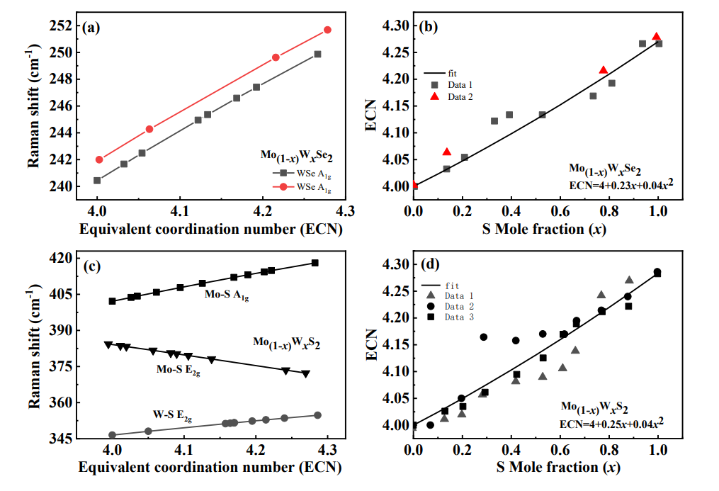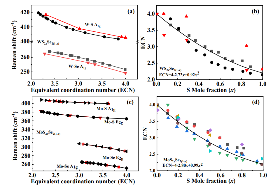 2.(a) and (c) Relationships between Raman frequencies and equivalent coordination number for WS2xSe2(1-x) and MoS2xSe2(1-x) monolayers. Figure 2 (b) and (d) Relationship between equivalent coordination number and doping concentration according to (a), (c).