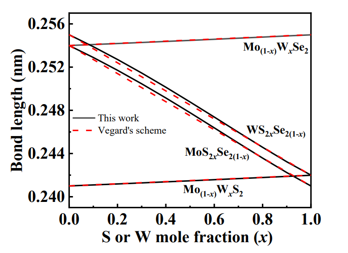3. Chalcogen atom S doping-induced bond length change for WS2xSe2(1-x) and MoS2xSe2(1-x); transition metal W doping-induced bond length change for Mo(1-x)WxSe2 and Mo(1-x)WxS2, showing the agreement between the calculated data from this work and the Vegard's scheme.
