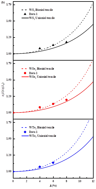 (a) Theoretical (solid lines) reproduction of the measured or simulated (scattered dots) in-plane size dependent-dielectric constant. (b) In-plane uniaxial and biaxial tensile strain effects of dielectric constant.
