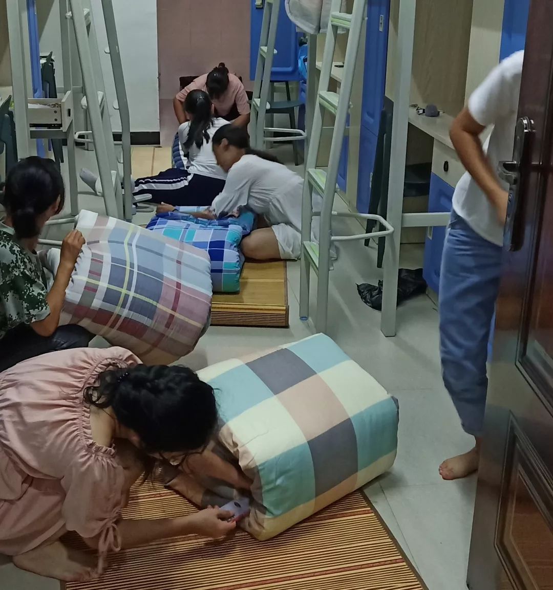 正在整理被子的新生