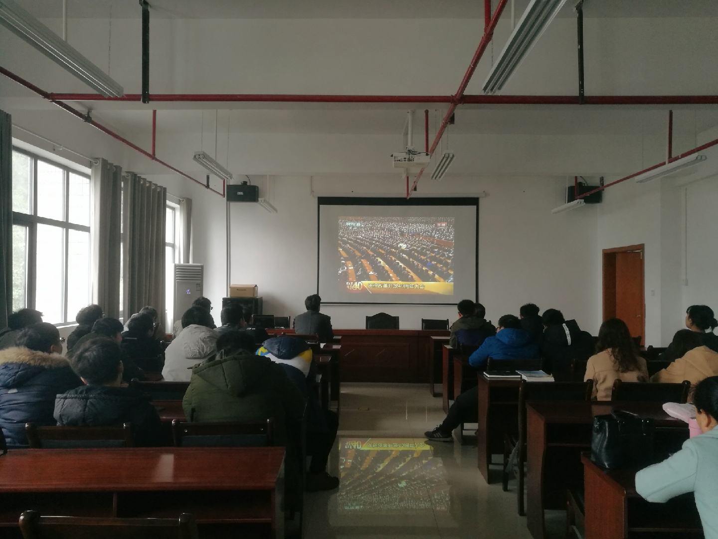 这天,william威廉亚洲组织2016级物理学(师范)全体观看庆祝改革开放四十周年大会直播,国旗升起,国歌响起的那一刻,全体肃然享受这一刻祖国带给他们的骄傲感。大会以表彰优秀个人为主,在表彰到于敏、马云、马化腾、袁隆平、李谷一、姚明、郎平这些耳熟能详的名字的时候,大家又给了他们一个新的称呼:改革开放优秀先进个人