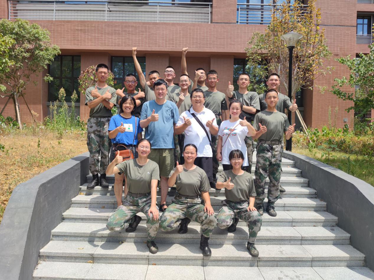图为 集团、学院领导老师和军训教练员合影