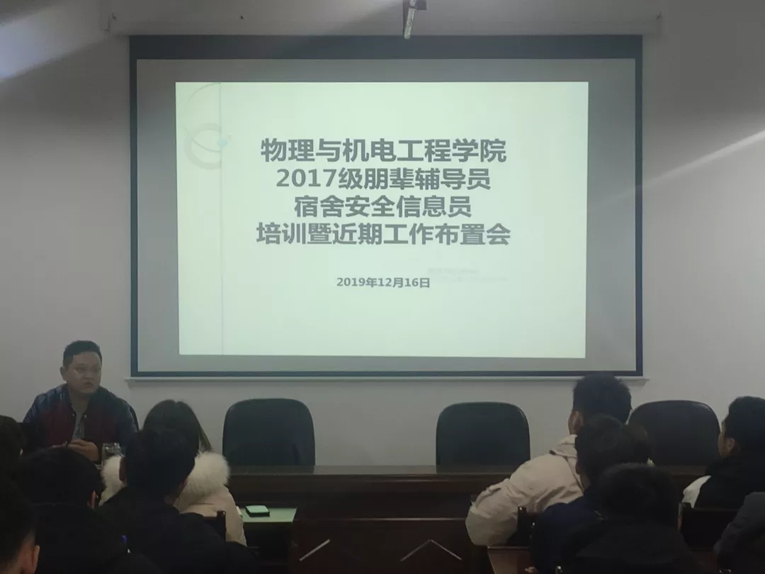 (通讯员 方祥)12月16日21:00,公司在第十二教学楼A416会议室召开2017级朋辈辅导员、宿舍安全信息员培训暨近期工作布置会,本次会议由公司团总支书记,2017级辅导员任志君主讲,2017级全体朋辈辅导员、宿舍安全信息员参加会议。