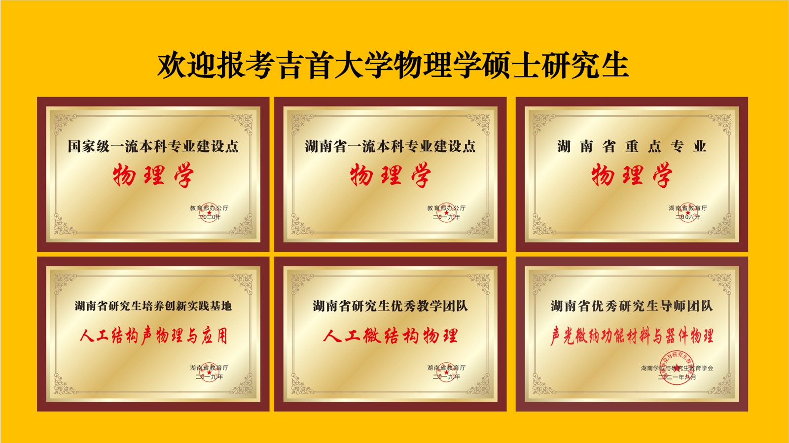 现有硕士生导师45人,其中教授24人,副教授18人,具有博士学位的导师占89 %,共有获全国优秀教师、湖南省芙蓉教学名师、湖南省青年骨干教师、湖南省教学能手、湖南省优秀研究生导师等称号的教师10多名,湖南省优秀研究生导师团队2个,湖南省研究生优秀教学团队各1个,形成了以教授、副教授为核心骨干,老中青相结合并以中青年为主,学历、职称、年龄结构合理的导师队伍。自2014年以来,校内导师主持国自科51项、省厅级项目80项,科研经费2000余万元。学院教师发表学术论文500余篇,近100篇发表于Phys. Rev. Lett.、Phys. Rev. A、Nat. Commun.以及Appl. Phys. Lett.等国际一流期刊。